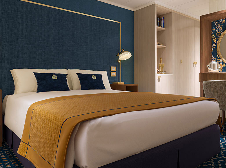 Priority embarkation ensures a feeling of privilege before you even step inside your superbly appointed suite, where a bottle of wine and succulent fresh strawberries are waiting for you. These are among the thoughtful flourishes that make you feel so warmly welcome, such as the fresh fruit replenished each day and personalized stationery. Should you wish, invite new friends for pre-dinner champagne and canapes in your separate living area – your concierge will gladly assist with any arrangements. After all, this is your refined and relaxing retreat. Here, you can seek out idyllic seclusion on your private balcony, complete with reclining seats.