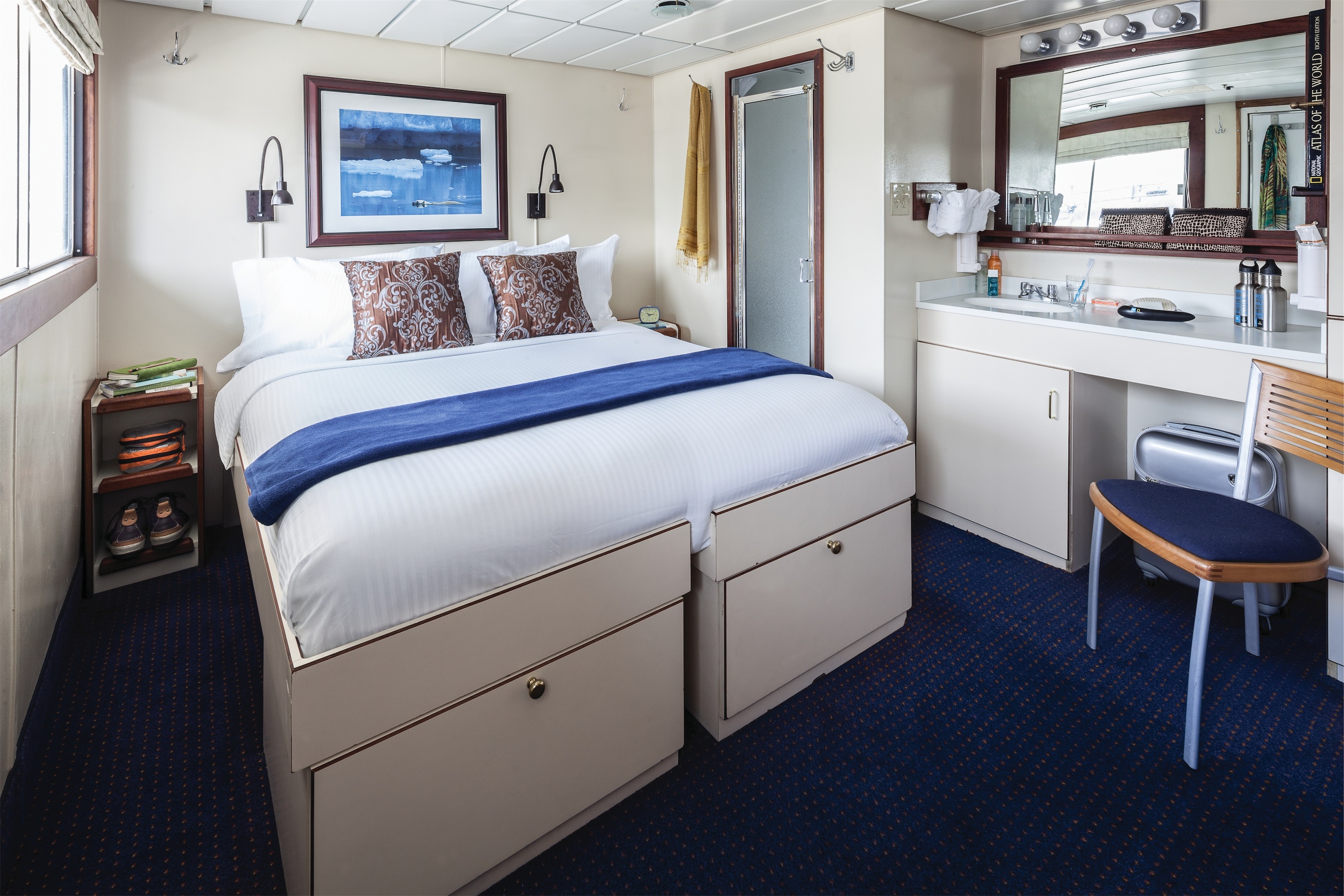 Conveniently positioned between the dining room and lounge, these cabins feature two single beds, a writing desk and a large view window. All cabins benefit from private facilities and climate controls.