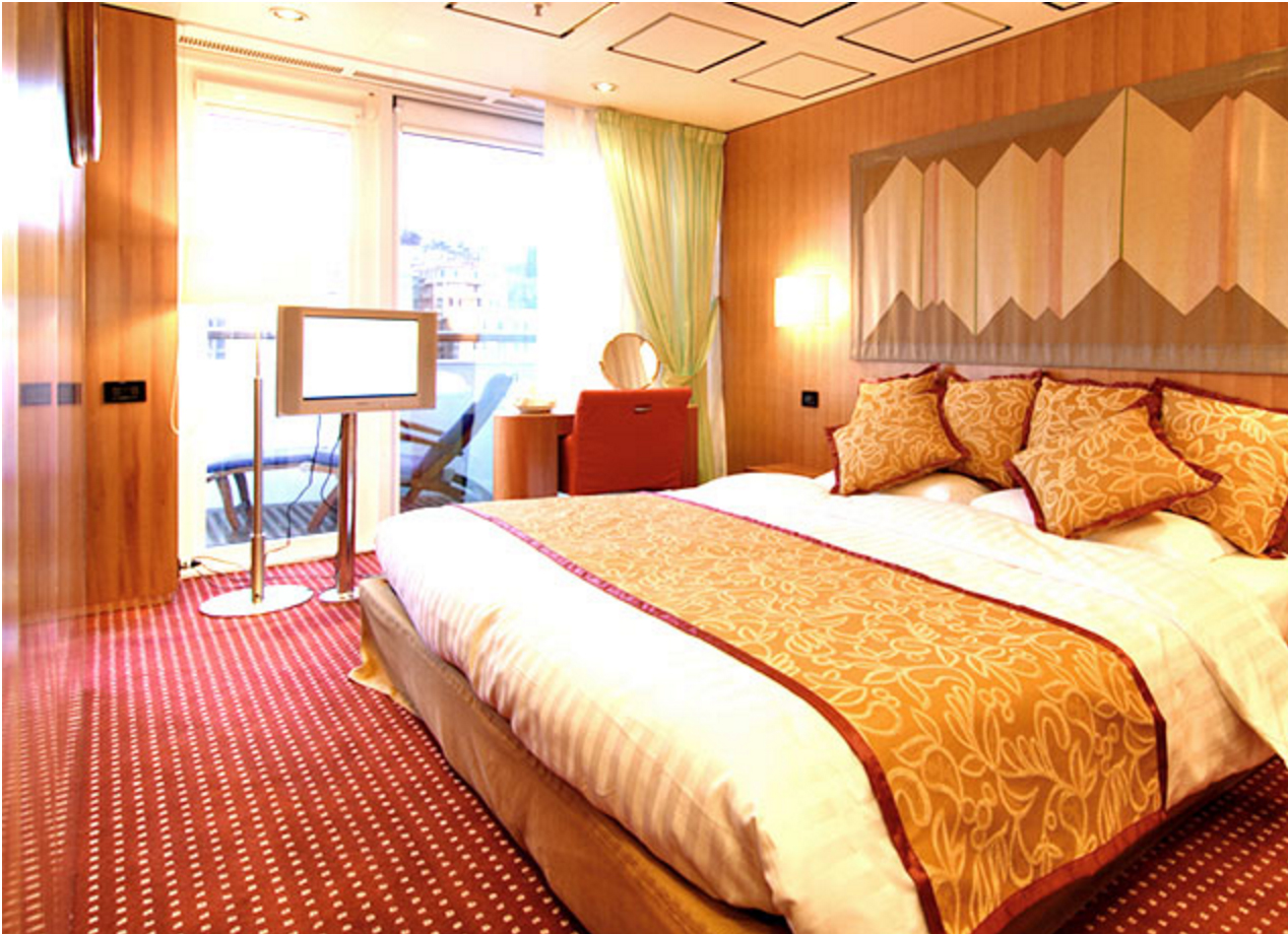 Oceanview stateroom, queen size bed, single sofa bed, single murphy bed, whirlpool bath, shower, sitting area and private veranda. Direct dial, ship-to-shore telephone service, television, mini-bar, hair dryer and safe deposit box in every stateroom.
