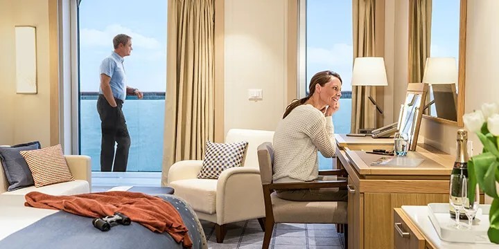 Stateroom size: 405 sq ft (includes private veranda) Ocean-view suite with floor-to-ceiling sliding glass door opening to a full-size veranda Wheelchair Accessible (#6020, #6021) 11 AM Embarkation 11 AM priority stateroom access Priority shore excursion reservations 87 days prior to departure. (Voyages embarking before May 31, 2024) Priority shore excursion reservations 127 days prior to departure (Voyages embarking on or after June 1, 2024) 3 priority reservations at each alternative restaurant 80 days prior to departure Priority spa treatment bookings 80 days prior to departure King-size Viking Explorer Bed (optional twin-bed configuration) with luxury linens & pillows Free Wi-Fi (connection speed may vary) 42" flat-screen TV featuring MSNBC, FOX News, National Geographic and more Additional 42" flat-screen interactive LCD TVs in sitting area 110/220 volt outlets & USB ports Large private bathroom with spacious glass-enclosed shower, double-sink vanity, heated floor, anti-fog mirror & hair dryer Premium Freyja® toiletries Plush robes & slippers Direct-dial satellite phone & cell service Security safe Individual climate control Purified water refilled daily Welcome bottle of champagne Mini-bar with alcoholic beverages, soft drinks, water & snacks (replenished once daily) Binoculars Traditional Norwegian Marius-weave blanket Personal coffee machine with premium coffee & tea selections Stateroom steward & twice-daily housekeeping 24-hour room service Complimentary laundry, pressing & shoe shine services Under-bed suitcase storage space Spacious drawers & closet with wooden hangers
