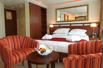 Stateroom Features:In-room temperature controlDeluxe hotel-style bedding with Egyptian linen, down pillows and duvetSpacious bathrooms with multi-jet showerheadsLarge wardrobe, full-length mirror, hair dryer, safe and direct-dial telephoneFlat-screen TV that also works as a computerEntertainment on Demand system providing complimentary TV, movies and music libraryComplimentary internet and Wi-FiComplimentary bottled water replenished dailyDesk and chair